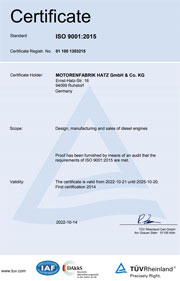 HATZ公司自1994年开始就实行ISO 9001:2015认证标准,形成了产品认证的基础。